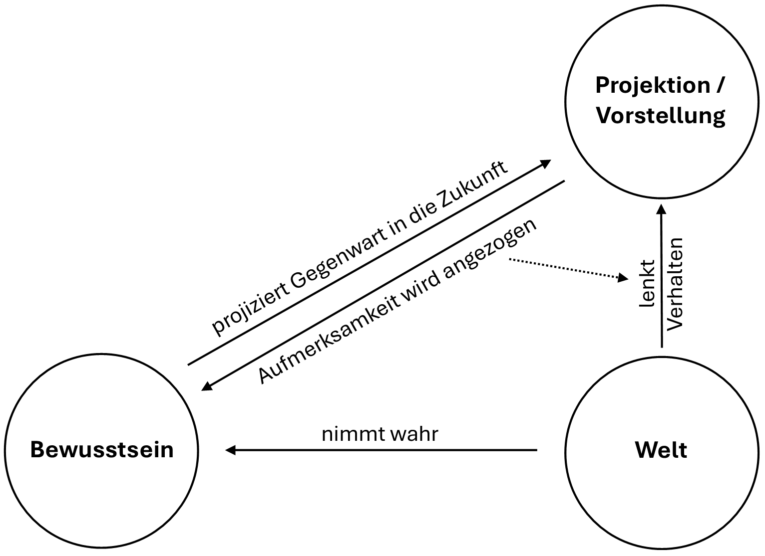 Es gibt keine Veränderung ohne Potential. Wenn die Welt verändernd auf das Ich einwirkt, dann erzeugt sie ein Potential, dem das Verhalten des Ich folgt. Ein Potential bedeutet, von etwas angezogen zu werden. Das Ich ist das, was wahrnimmt. Wenn etwas anziehend auf das Ich wirkt, dann zieht es die Wahrnehmung des Ich an. Das Ich kann seine Wahrnehmung lenken wie einen Scheinwerfer, der über eine Landschaft streift und es lenkt seine Wahrnehmung auf das, wovon es angezogen wird. Das ist das Potential, welches "die Welt" auf "das Ich" ausübt und dem das Verhalten des Ich folgt: Das Ich folgt mit seiner Wahrnehmung dem Potential, das von der Welt ausgeht.